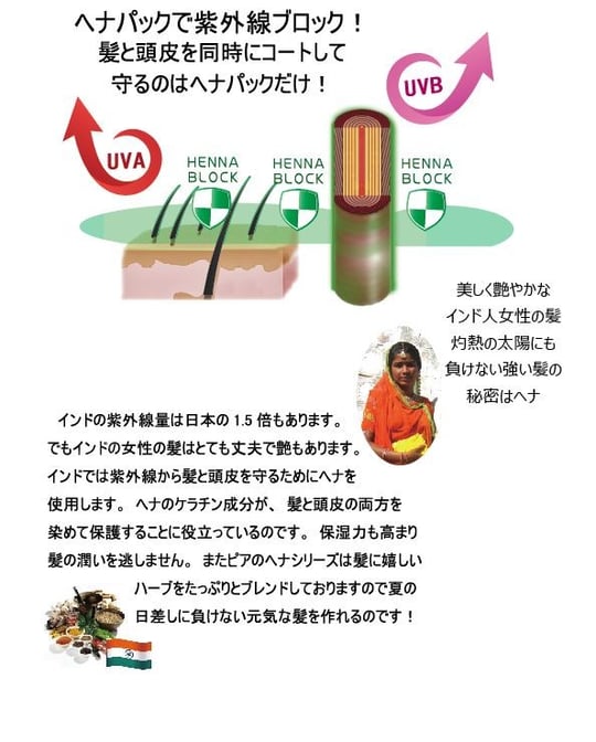 またヘナの葉に含まれる天然植物色素(ローソン)は髪のタンパク質ケラチンと相性が良く、キューテイクルにまとわりつきます。それが皮膜となり、髪を保護しながらハリと艶を与えます。美容業界のヘアケア製品においても、自然で安全なヘアパック原料として活用されております。